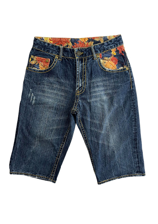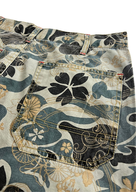 2010s Nishiki Japanese Embroidered Kimono Flower Denim Shorts