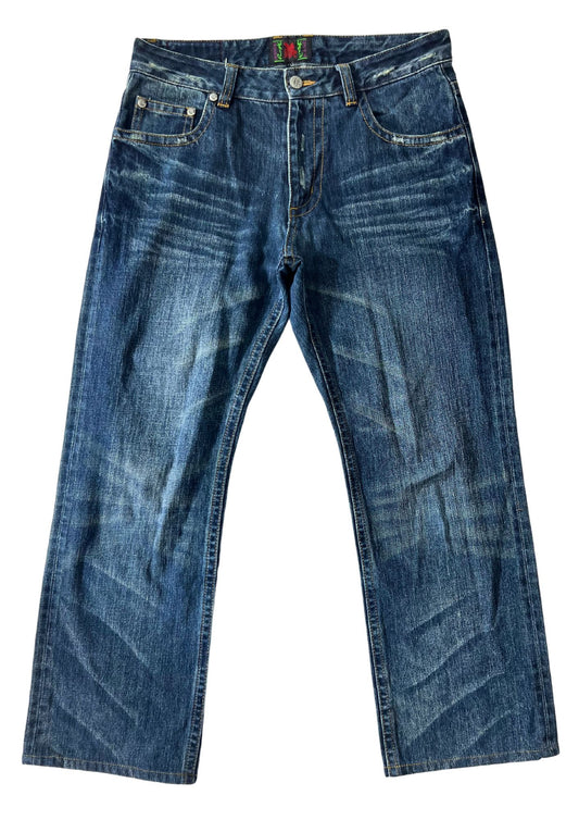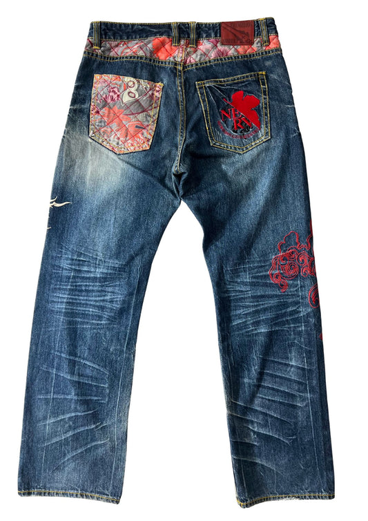 2000s Vintage Neon Genesis Evangelion x NISHIKI 'Type 01 Japanese Pattern' Embroidered Jeans (36")